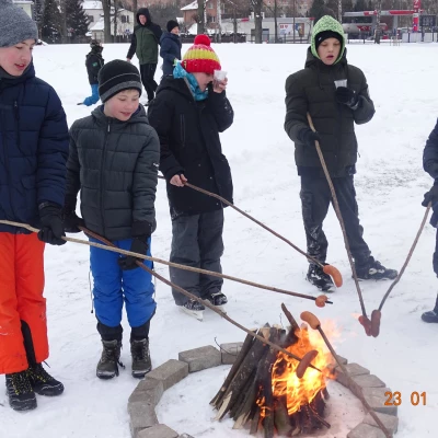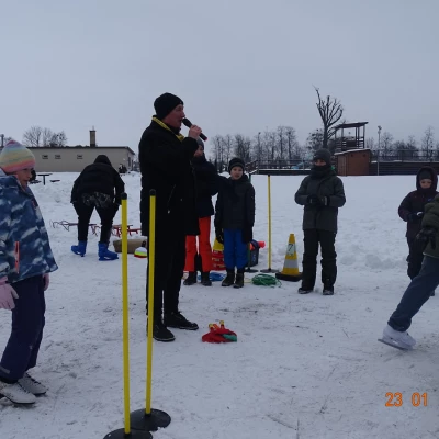 W pierwszy piątek ferii przygotowaliśmy Gry i zabawy na lodzie, w których dzieci i młodzież rywalizowały w trzech grupach w wyścigach sprawnościowo-szybkościowych. Oczywiście nie była tu prowadzona żadna klasyfikacja ponieważ wszyscy byli zwycięzcami. Na koniec zmagań wszyscy wybrali się na wspólne ognisko oraz drobny słodki poczęstunek.